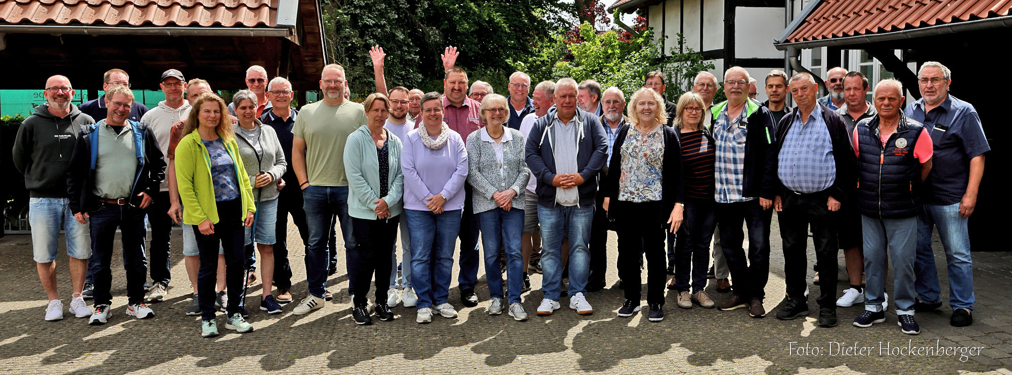 Gruppenfoto der Teilnehmer der AZ‑IG‑Agapornis/Forpus Tagung 2025 vor dem Heimathaus Harsewinkel am Sonntag mit Referent Jörg Ehlenbröker.