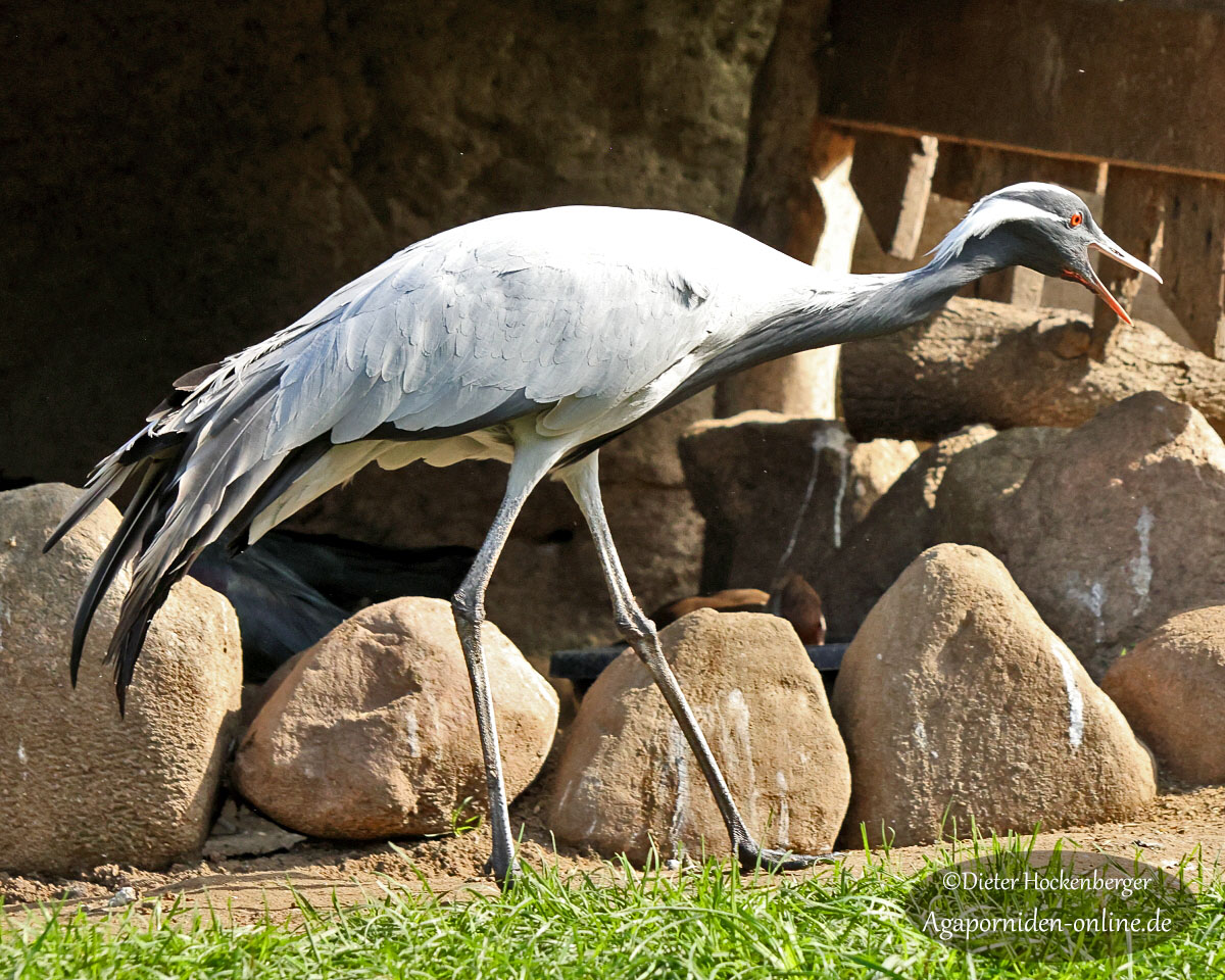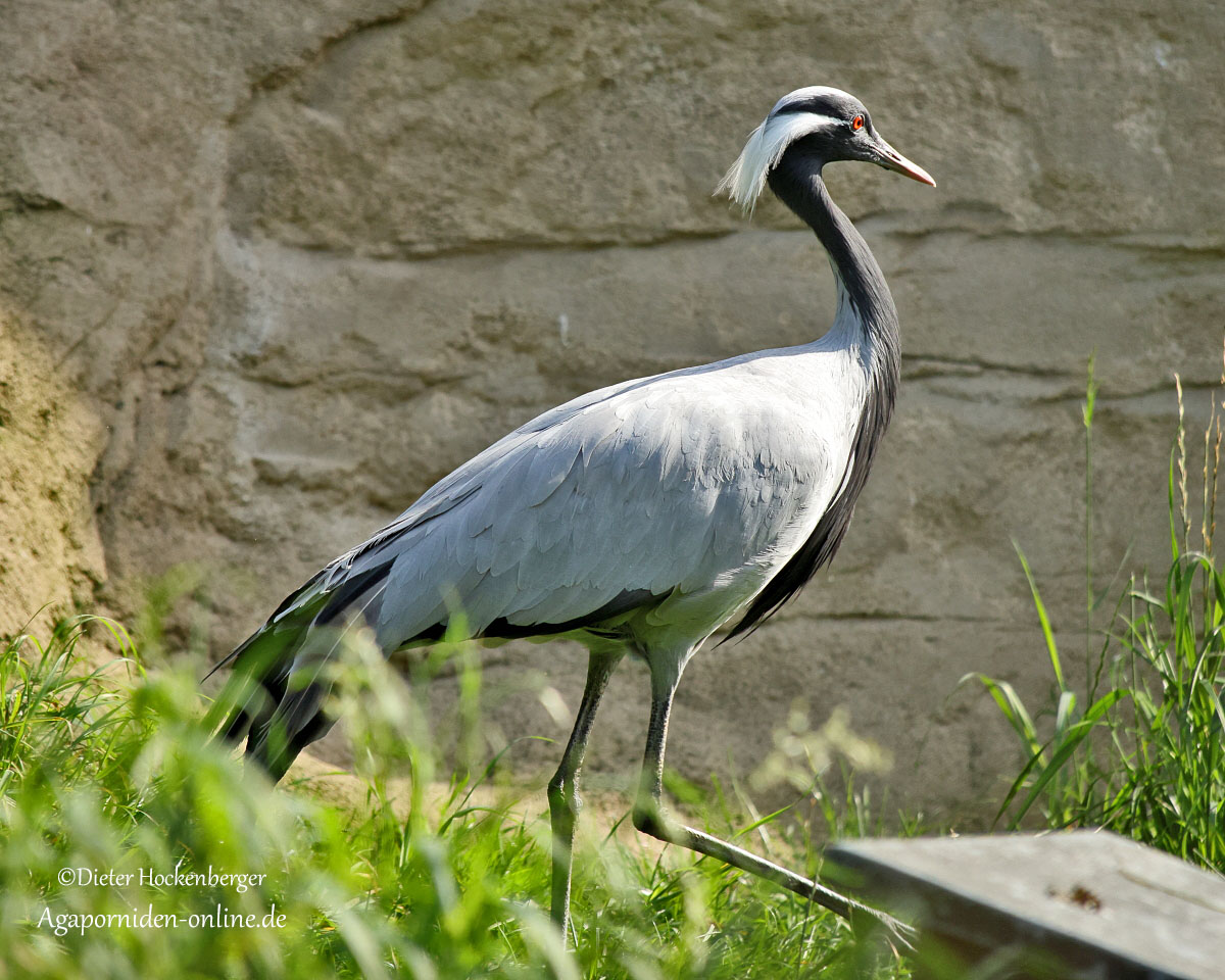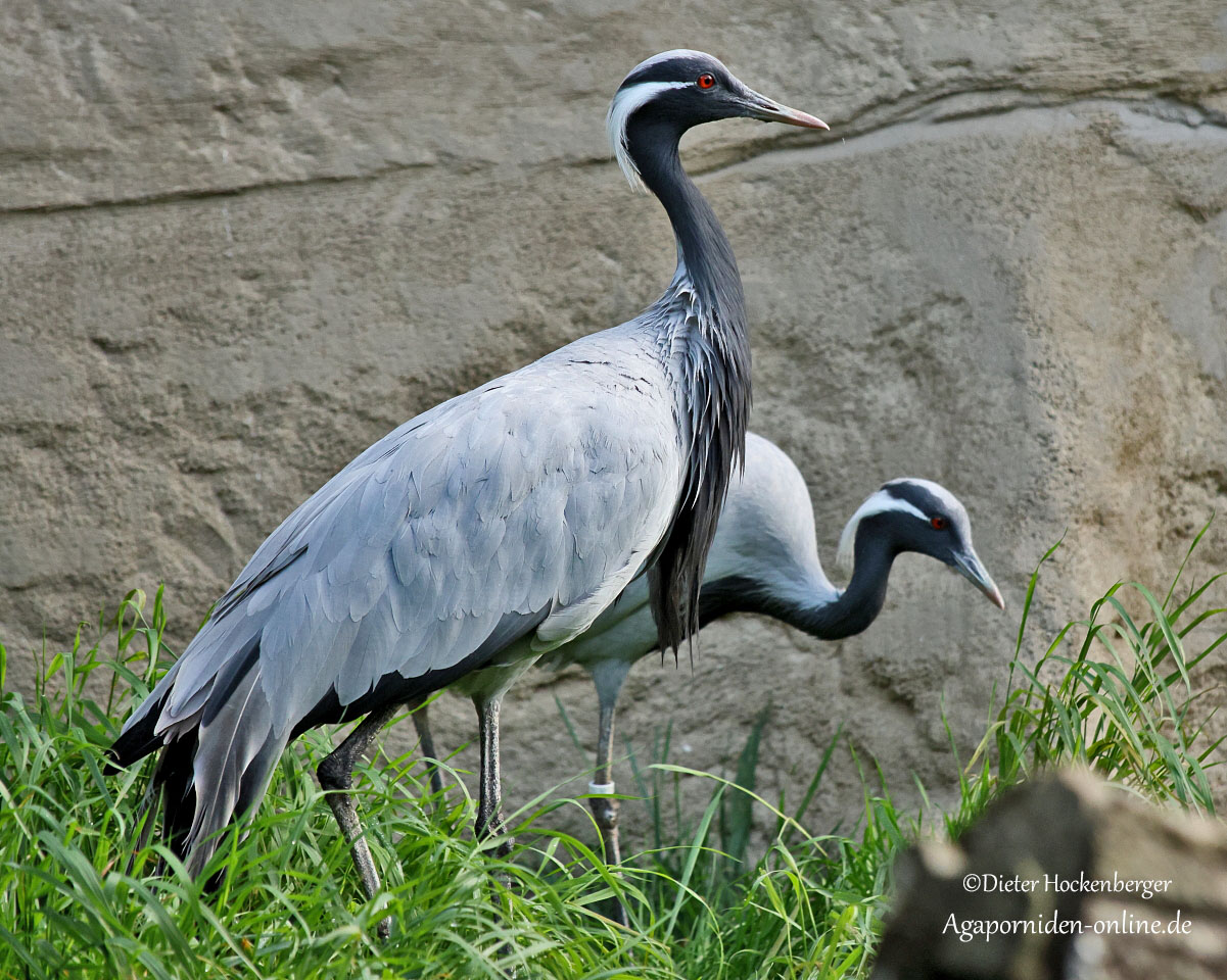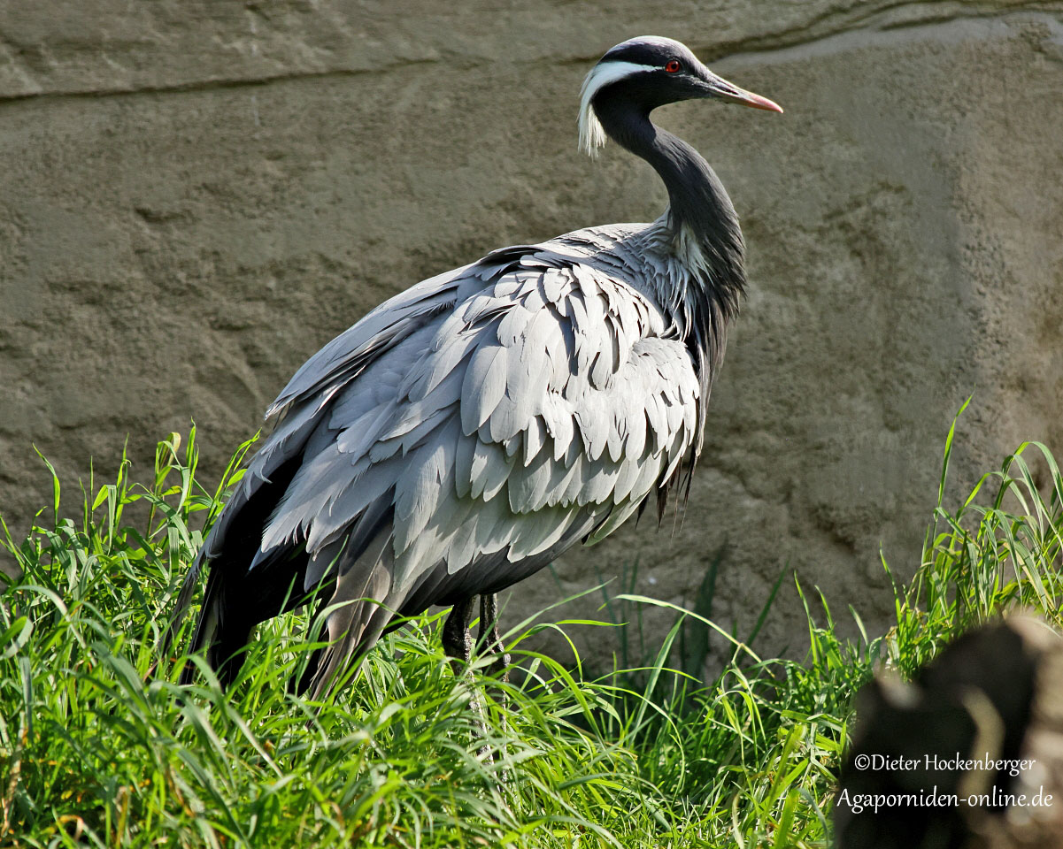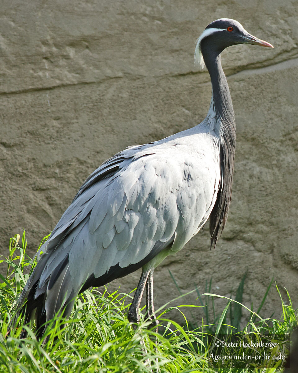 - schlanker Körper, hellgraues Gefieder, schwarzer Hals mit langer weißer Federsträhne hinter den Augen.